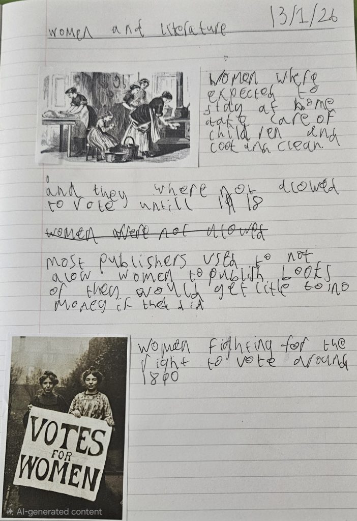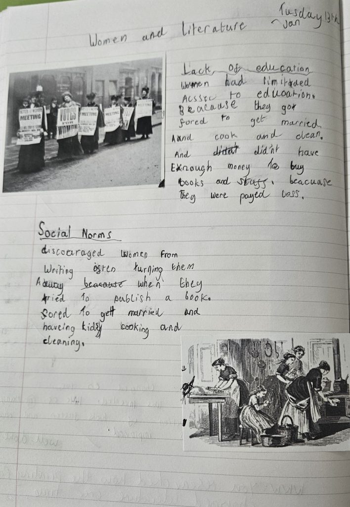 This term, 9b will explore how women have been represented in literature across different time periods. We started by researching the challenges women writers encountered throughout different historical periods, including limited social freedoms, restricted access to education, and barriers to publishing.